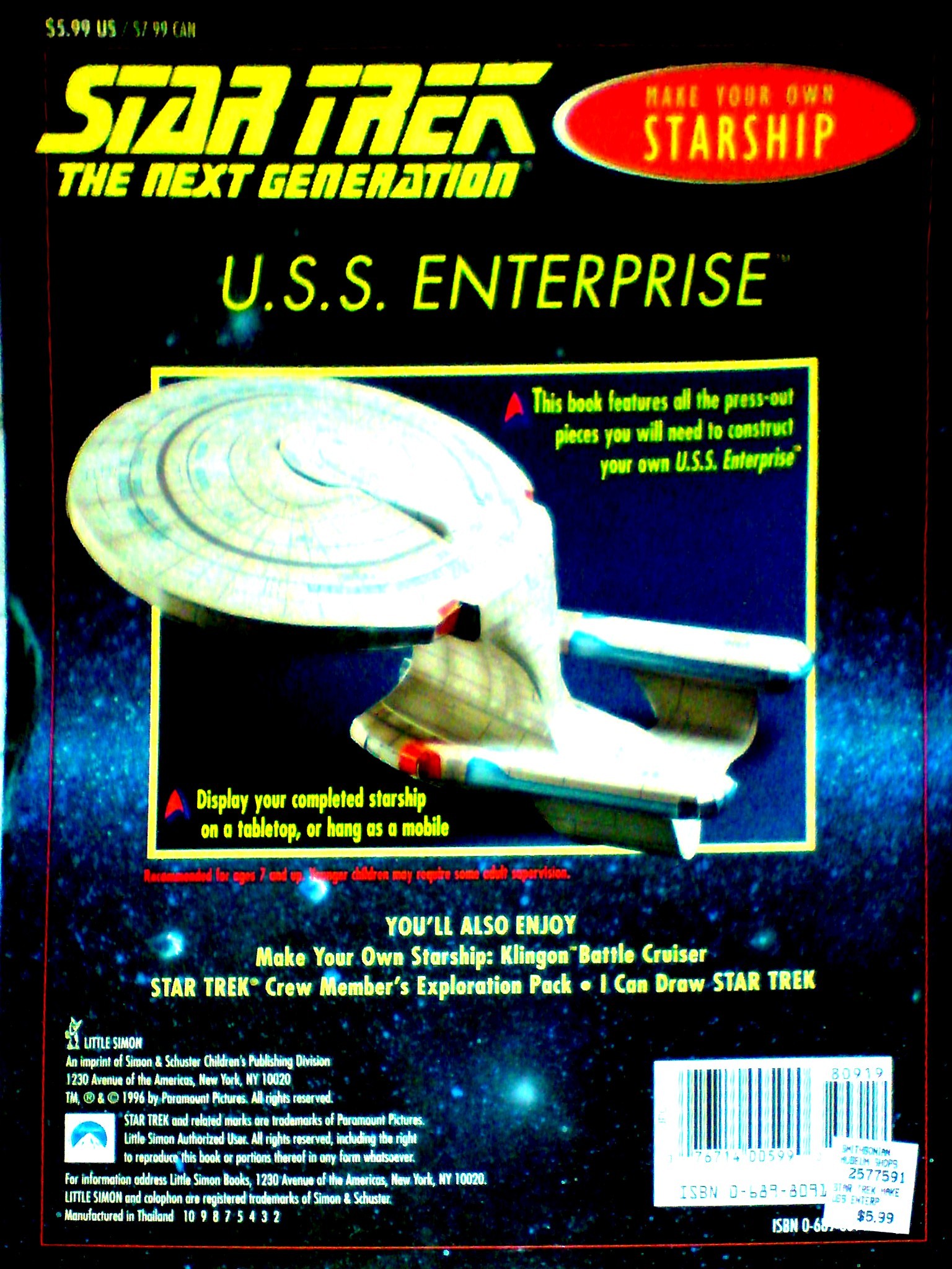 Ambling through the Smithsonian museum one day circa 1996 my future darling girlfriend came across this book-kit to make a starship Enterprise out of card, and had the good sense to purchase it as an impromptu treat. She procrastinated over assembling it for 16 years, but when I saw it naturally I couldn’t resist but take it and build. On first impressions it seems like a simple push-out-and-slot-together kit that might be assembled by seven year olds (as advertised on the back cover, figure 1b), but one quickly realises on perusing the instructions printed inside the covers that glue and degrees of planning, cunning and patience are required.