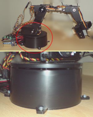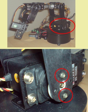 There is some free play in the overall robot construction, but by far the most noticeable is in the fixing of the upper arm to the shoulder. This is caused by the holes through which the servo horn screws pass are bigger than the screws themselves, and the cohesion between the bracket and the (smooth nylon) servo horn is insufficient to hold the arm in place.