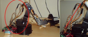 Because the control of the motors is local closed loop, it is the position of the motor shaft, hence the horn, that is controlled; there is no direct control over the position of the arm itself. If this kind of feedback were available, it would be relatively easy to compensate (to a limit) for this looseness. Perhaps we can find a way to take the potentiometer out of the motor housing and use it to act directly on the arm? But that would cause real problems when an attempt is made to hold the arm at a position (near equilibrium) where it will never stay.