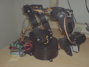 This document is based on the LynxMotion AL5A manipulator arm, plus the lightweight wrist-rotate extension. This is the smallest arm that LynxMotion provide, and was chosen as it represents the cheapest entry into a fascinating hobby, you can do all the experimental stuff that you could with a bigger arm, and it is also a bit more stable than a bigger arm due to smaller leverage action. The arm is composed of aluminium brackets pivoted together. The axes of all the pivots are very physically the axes of the output shafts of the electric motors, which not only drive the arm but provide much of the strength of the construction; these are completely sealed units housing the motor, gearbox, position feedback sensor and control electronics. While the built-in electronics use dynamic position feedback to control the motor positioning, it is not possible to return this position information back to the controlling PC via the serial cable; nor is it possible to get a measure of the effort which the motors expend in carrying out manoeuvres.
